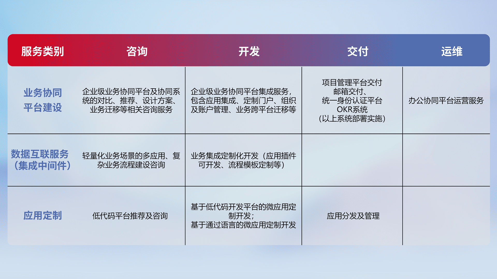 针对钉钉、、企微、、IDaas等平台级产品提供产品的规划、、方案、、交付、、定制化开发等服务,,,实现如统一协同办公、、智能客户服务、、混合会议管理、、智能数据查询、、、、等业务场景,,,实现数字化转型。。。
